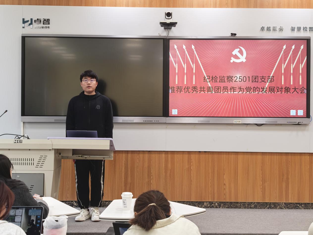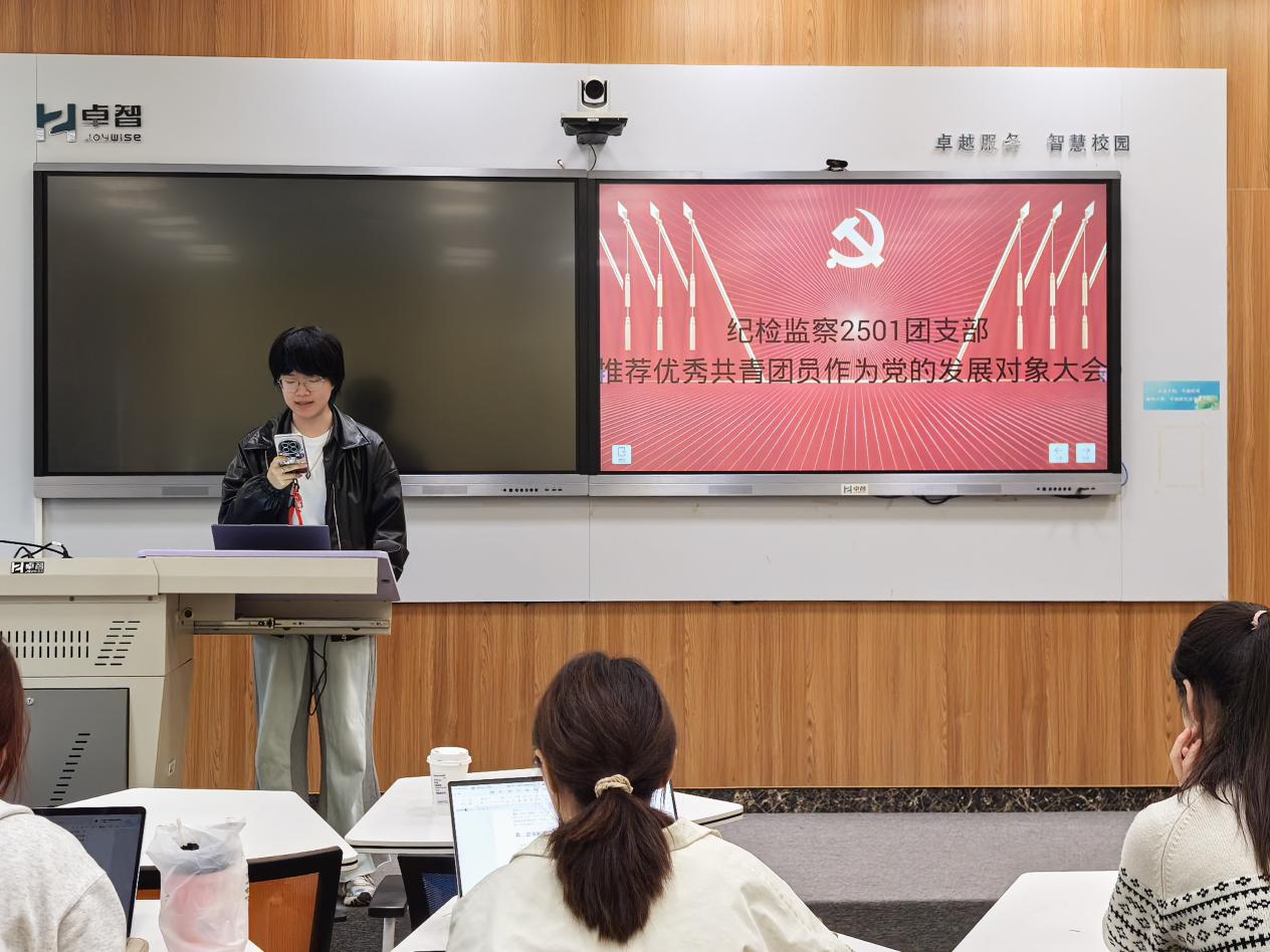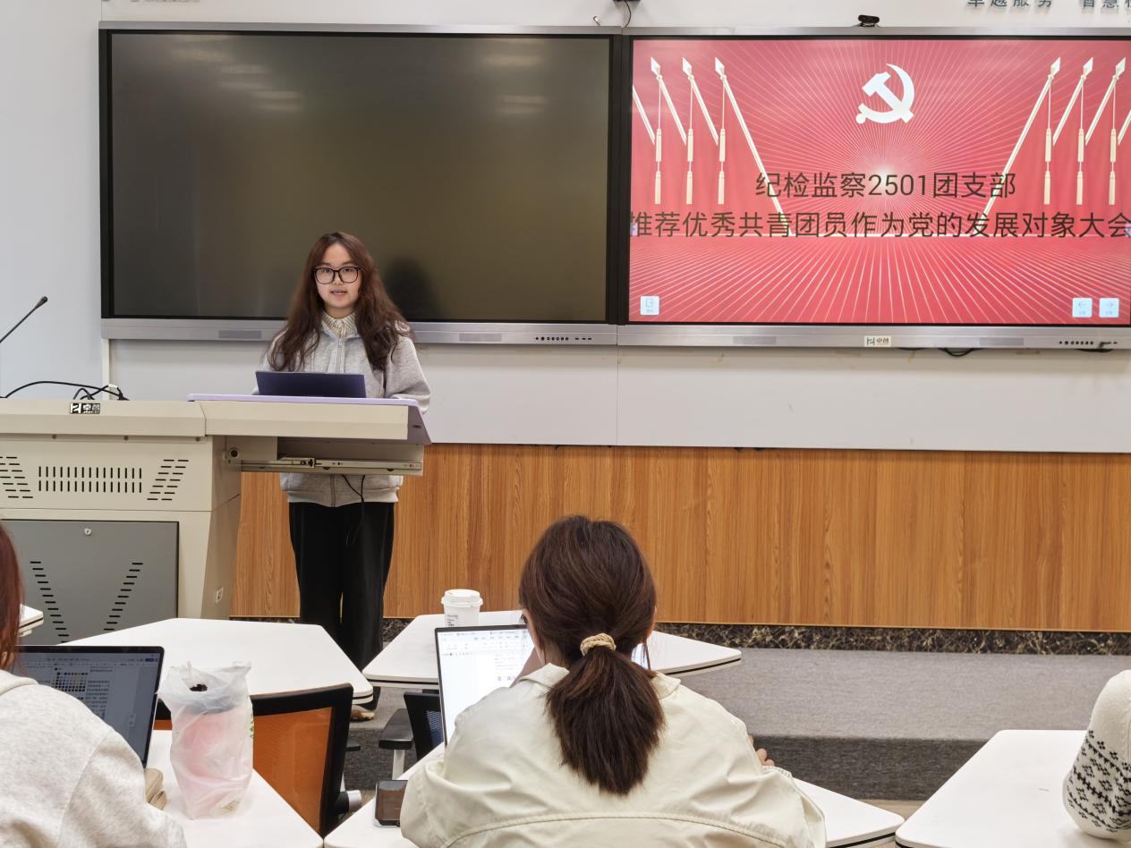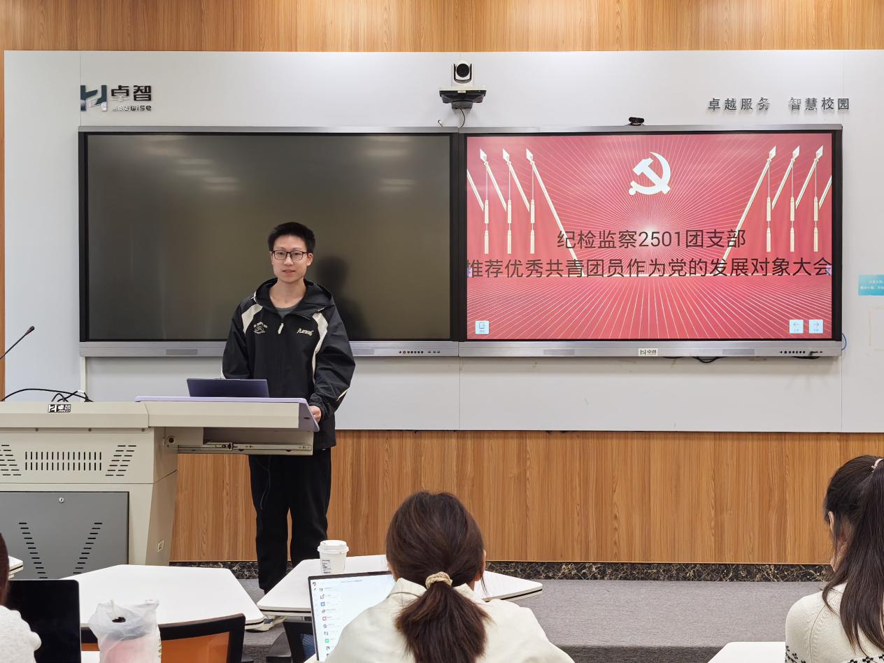 会上,团支书贺湘诗首先重申推优入党相关标准与纪律要求,引导全体团员对照条件严格自查,确保推优工作政治方向正确、评选尺度统一。组织委员杨安悦逐一介绍参与本次推优团员的基本情况,帮助参会同学全面了解候选人。随后,参选团员依次上台,围绕思想政治、道德品行、作用发挥、执行纪律等方面展开个人陈述,重点分享入党动机、理论学习收获与接受培养教育的心得体会,展现出积极向党组织靠拢的坚定信念与良好风貌。