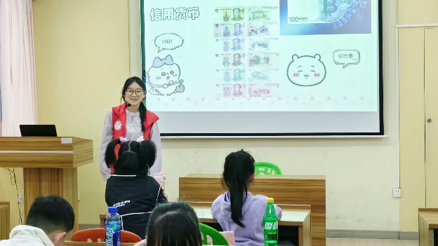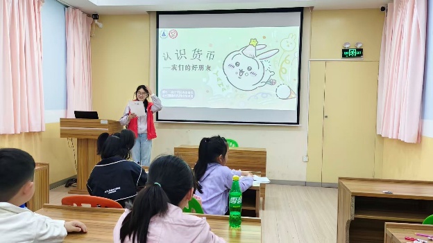活动伊始,志愿者引导孩子们有序结对入座,并发放了面值各异的练习币,提醒大家妥善保管这份“第一桶金”。主讲老师以“解锁金钱小管家”任务趣味破题,通过提问互动迅速点燃全场热情,孩子们争相举手,眼睛里写满好奇与期待。