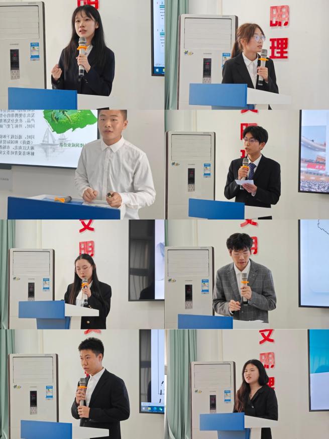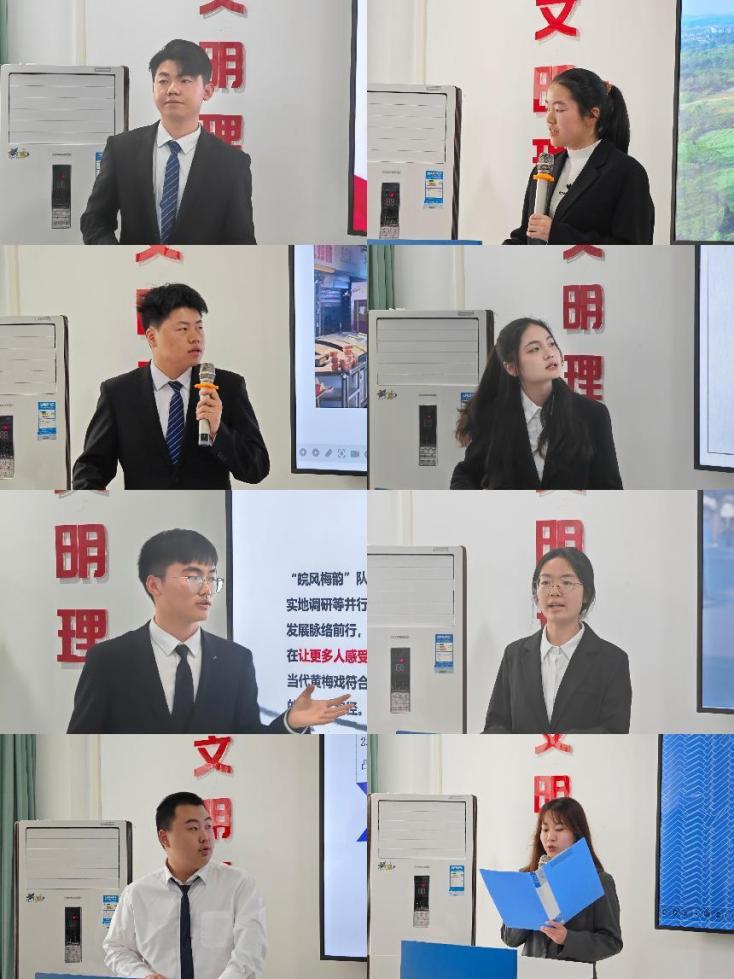 会议伊始,各组依次上台进行项目介绍与风采展示。在此次寒假社会实践中,各队伍的实践选题新颖、涉猎广泛、内容丰富、方式多样。胡括州同学所在团队以二十大发展养老事业产业为选题背景,对养老产品诈骗展开调查,积极维护老年人权益;前科效应探寻队通过大量的实地调研与数据分析,提出限缩前科报告和完善犯罪记录制度的优化路径;晋若冰同学所在团队以“小田并大田”推进高标准农田建设的多举措研究,为乡村振兴出谋划策;“津津有味”学生公益创业团队深耕定点帮扶,既带货农产品,又助力乡村教育。此外,同学们还结合专业特点,将目光聚焦于云取证、非物质文化遗产保护、地摊经济等选题,展现出我院学子广阔的学术视野和浓厚的家国情怀。