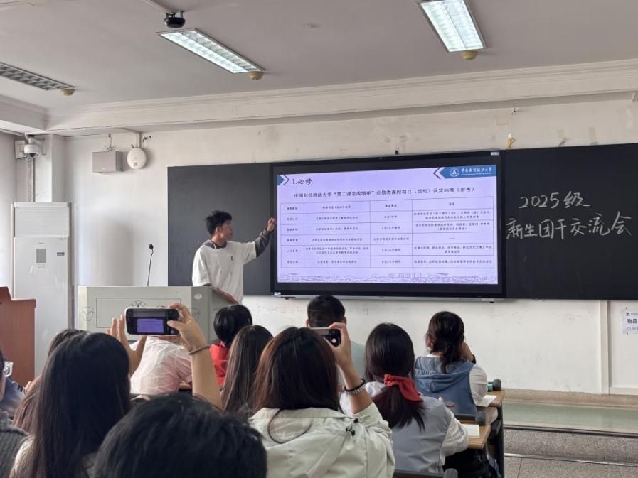 随后,组织部社会实践办公室部长郭志鹏就“第二课堂”平台的操作应用进行专题培训。他系统介绍了“第二课堂”课程的分类,通过现场演示的方式,清晰讲解了平台登录、活动报名、学分认定等操作流程,并针对活动补录的申请条件、办理流程及时间节点等关键事项作出补充说明,助力新生团干部准确掌握“第二课堂”管理工作要点,更好地服务班级同学成长发展。