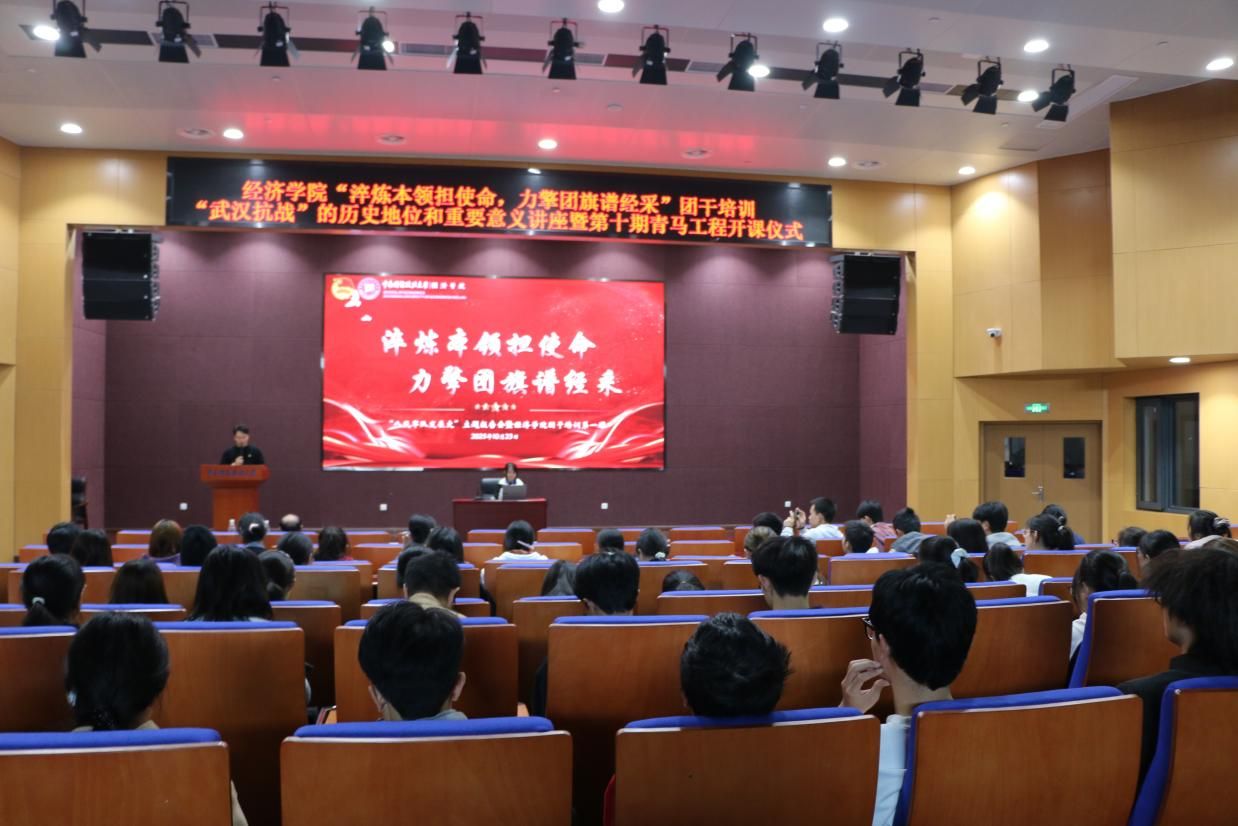 新闻网讯(学生通讯员 王熙丞 周佳怡)学史明志,知史砺行。为培养经济学院团委、学生会、志愿者协会(以下简称“团学组织”)学员和新发展团员及学院青苗班、青禾班、青马班学员的革命精神和政治素养,推动团学组织发展,经济学院2025年团干培训第一课——“武汉抗战”的历史地位和重要意义讲座暨第十期青马工程开课仪式于10月23日在南湖校区文瀚楼一楼南隆重召开。中南财经政法大学原经济学院党委书记、现学校离退休人员党委副书记、学校关心下一代工作委员会副秘书胡江滨教授,经济学院团委书记、2025级本科生辅导员陈远瞻参会。学院青苗班、青禾班、青马班学员,2025级团学组织新学员,2025年新发展团员到场参加培训,会议由陈远瞻主持。