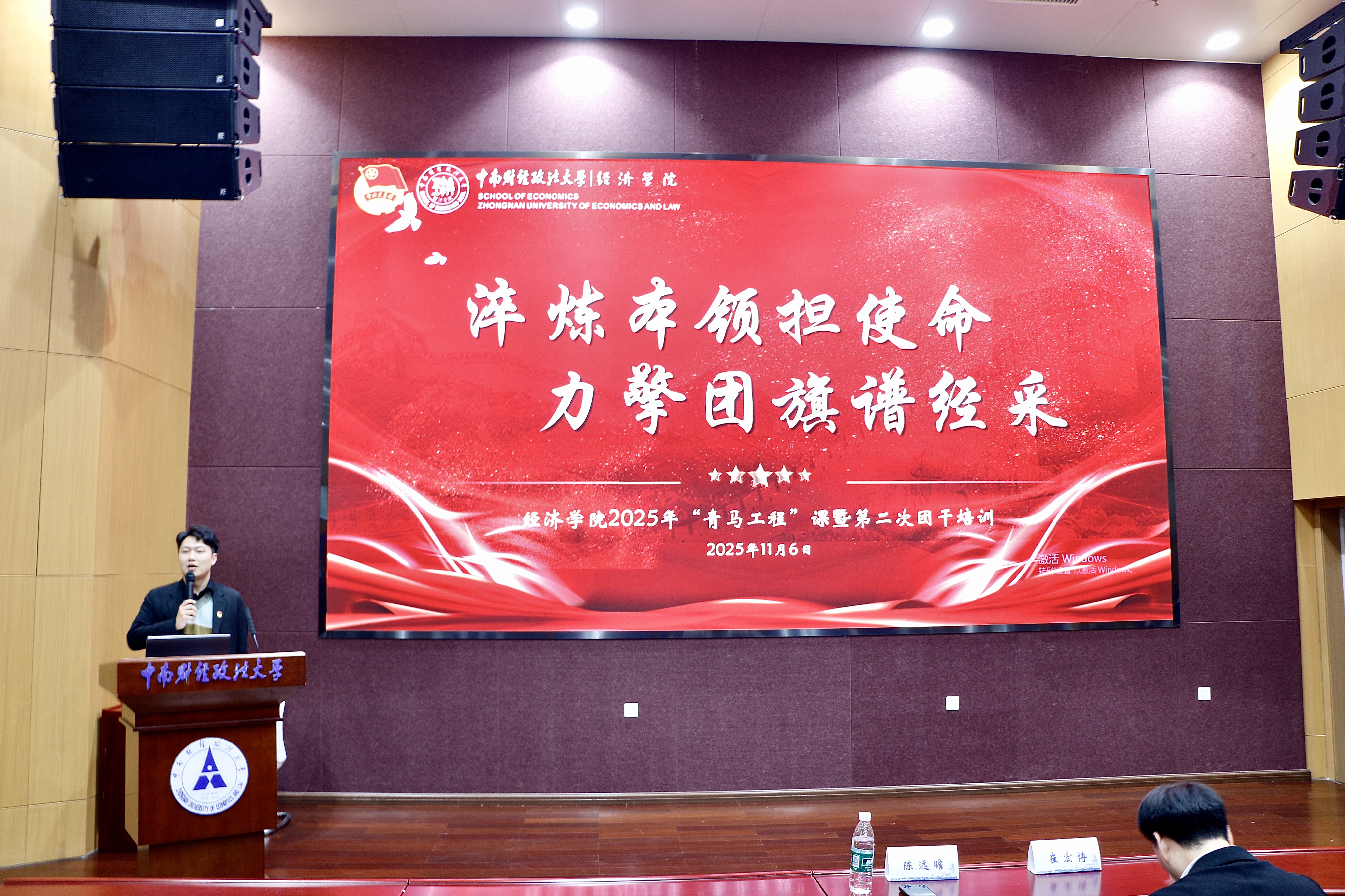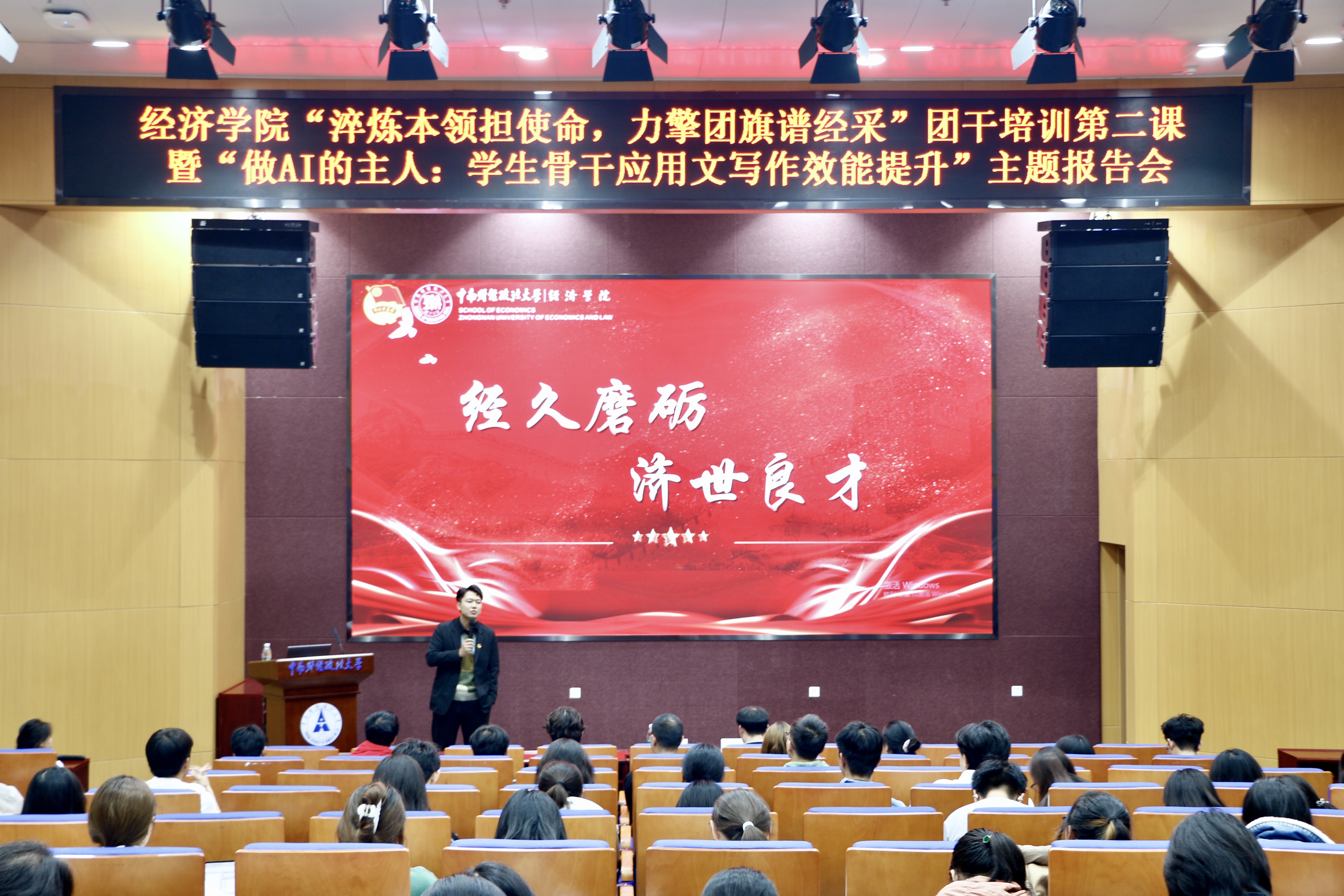 新闻网讯(学生通讯员 吴迪宇昂 郭紫琳)为了深入贯彻新时代青年工作理念,全面提升学生骨干应用文写作能力,增强基层团组织“三力”,2025年11月6日下午,中南财经政法大学经济学院2025年“做AI的主人”主题报告会暨团干培训第二课于南湖校区文翰楼北报告厅顺利举办。经济学院团委书记、2025级本科生辅导员陈远瞻与华中师范大学文学院团委书记崔宏博受邀担任嘉宾,学院2025级学员参会。