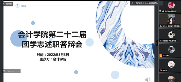 新闻网讯(学生通讯员 唐珂萱 摄影 姜宇静 万典)2022年3月3日下午两点,会计学院第二十二届团学志述职答辩会顺利开展。述职答辩会旨在加强各部门间的合作与联系,总结上学期工作经验与不足,展望新学期工作开展方向。为落实学校疫情防控要求,本次述职答辩采用线上线下相结合的形式举行。会计学院团委书记陈俊华老师,团委副书记杭慧喆老师以及团学志主席团成员,各部门部长、副部长与全体学员参加了本次活动。
