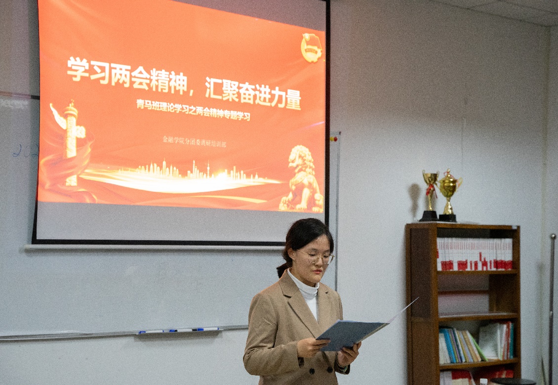 新闻网讯(学生通讯员 查莉芳 摄影 吴彦恺)为积极宣传贯彻落实两会精神,将全国两会凝聚起的信心和力量传递给学院青年骨干,3月27日晚上七点,金融学院第十五期青马班于文泉南308开展两会精神专题理论学习。工商管理学院分团委副书记杨业兴作领学分享,金融学院分团委副书记孙雪妮和十五期青马班全体学员参加此次学习。