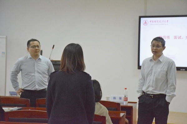 随后,由韩俊总监开展就业、实习宣讲。他向现场学生播放了中信建投证券公司就业招聘宣传视频,简要介绍了中信建投证券公司的发展历程和业内地位实力,重点说明了中信建投的人才培养模式,同时分析行业前景来解释了公司为何重视校园招聘,通过展示职业发展路径为同学们明晰未来发展、鼓舞号召同学们进入行业,并在最后介绍了本次招聘的岗位和对应要求。