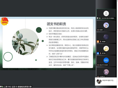 随后,由组织部副部张雪吟介绍青年大学习和团支部手册撰写工作。首先她向大家强调了青年大学习的重要性,并说明了青年大学习的相关工作,包括积极转发链接、提高参学率、确认信息正确等。之后,她为参会人员介绍了团支部工作手册的填写规范问题,提出团支部工作手册的填写要注重思想建设、组织建设、活动开展、会议记录及关于团支部手册的上交与发放问题等五个方面的内容。