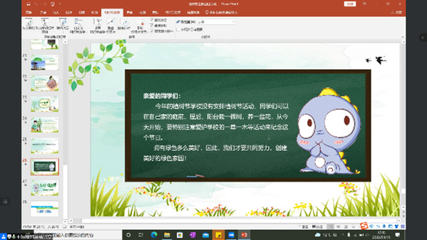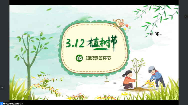 其次, 主持人介绍了植树节的历史与由来,意义与价值。为扩展同学们的知识储备并增强娱乐性,主持人带大家观看了短视频《奇妙的植物》,让同学们对植物有了更高的兴趣。新中国成立后的1979年,在邓小平提议下,第五届全国人大常委会第六次会议决定将每年的3月12日定为植树节。2020年7月1日起,施行新修订的《中华人民共和国森林法》,明确每年3月12日为植树节。习近平总书记多次强调“保护生态环境就是保护生产力,改善生态环境就是发展生产力”。