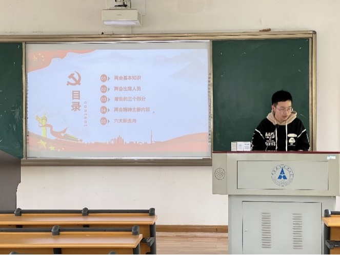 中华人民共和国第十三届全国人民代表大会第五次会议于2022年3月5日在北京召开。各班均通过观看两会相关视频等方式学习了十三届全国人大五次会议中国务院总理李克强关于政府工作的报告,从2021年工作回顾中了解过去一年的发展成果及民生状况,从2022年经济社会发展总体要求和取向中把握2022年发展预期目标,认真汲取并学习贯彻了两会的伟大精神,把握了时代的伟大任务,以实际行动迎接党的二十大胜利召开。各班团支书都号召在场青年学子要全面贯彻习近平新时代中国特色社会主义思想,深刻领悟“两个确立”的决定性意义,增强“四个意识”,坚定“四个自信”,做到“两个维护”,不忘初心、牢记使命,凝心聚力、开拓进取,勇做立于时代潮头的时代新人!