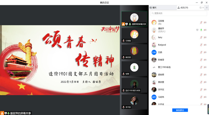 造价1901团支部活动形式多样,内容丰富。主持人以关键词的形式解读两会精神,提高了全体成员的政治素养,坚定了理想信念。过去一个月,造价1901团支部的女生两次经历封楼,楼外男生志愿者请缨而出,分工明确,帮取快递,代购物资……充分践行了雷锋精神。最后飞花令的小游戏与节水知识相融,调动了全体成员的积极性。