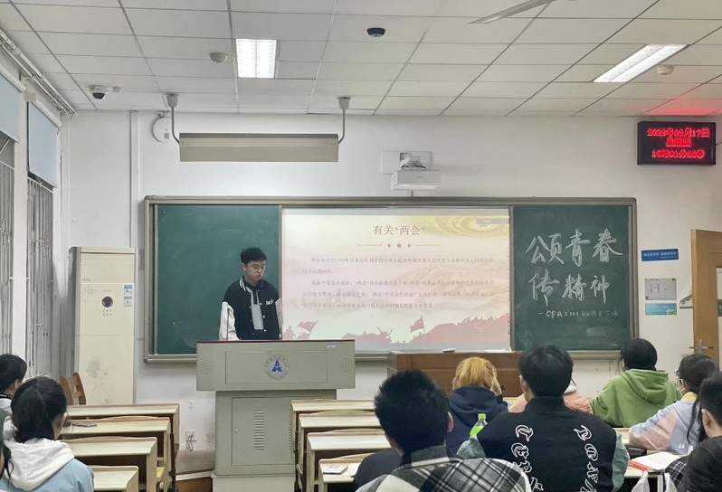 CFA2101团支部在激昂的国歌旋律中拉开了团日活动序幕。首先团支部书记及支部成员讲解两会精神,分享学习经验,并指出:两会是中国的窗户,关注中国就不能不关注两会。接着,团支部书记带领全体成员了解雷锋纪念日以及雷锋名言,并将雷锋精神与当前疫情大背景有机结合,充分展现了雷锋精神的时代价值。最后全体成员观看环保视频,对“树理念,卫环境”有了更多的体会,对新时代的发展理念有了更深的思考。