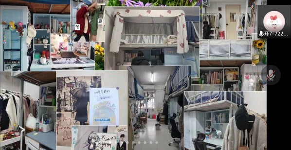 本次寝室建设大赛分为21级寝室文化大赛与20级寝室风采大赛,通过材料初评、入寝检查、线上展示三个环节,从寝室介绍、寝室文化、寝室公约三个维度,全面考察参与寝室的文化风采。3月17日,学生会各部门代表组成评审团走进参评宿舍,根据寝室卫生情况、文化建设风采和主题设计特色依次评比。4月9日上午9点半,穆帆、莎吉丹姆和李奥老师与学生会主席团组成评审团,于线上对晋级寝室展示情况进行考察。各参赛寝室分别对寝室成员、寝室故事及特色活动等进行了介绍,四人语音将温馨传递、恰恰热舞把热情点燃;手绘头像尽显有趣灵魂、寝室课堂饱含友爱温情……