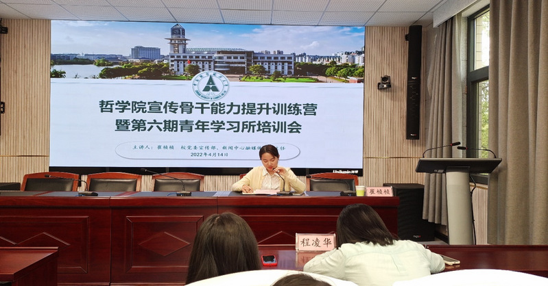 新闻网讯(学生通讯员 李嫚 朱家辉)宣传有力量,行动在路上。为加强哲学院宣传工作建设力度,培养更优秀的哲学院宣传人才,结合新时代青年发展要求,我院在4月14日下午于文沛楼二楼会议室召开哲学院宣传骨干能力提升训练营暨第六期青年学习所培训会。本次培训会我院有幸邀请到校党委宣传部、新闻中心融媒体中心主任崔桢桢老师和校党委思政中心主任、哲学院PPE专业兼职辅导员程凌华老师进行授课,哲学院分团委书记陈意萍老师出席本次活动。团委宣传部、学生会新媒体中心、志协宣传部、研究生宣传部门等宣传部门成员参与此次宣传骨干训练营并进行青年学习所学习。
