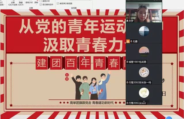 新闻网讯(学生通讯员 孙梦)为庆祝建团100周年,团结引领广大团员青年永远跟党走,奋进新征程,以实际行动迎接党的二十大胜利召开,马克思主义学院青年学习社于5月12日下午3点采取线上形式为公共管理学院青年马克思主义培训班开展宣讲活动,本次宣讲活动主题是“从党的青年运动史中汲取青春力量”,由我院青年学习社成员孙梦负责讲授。