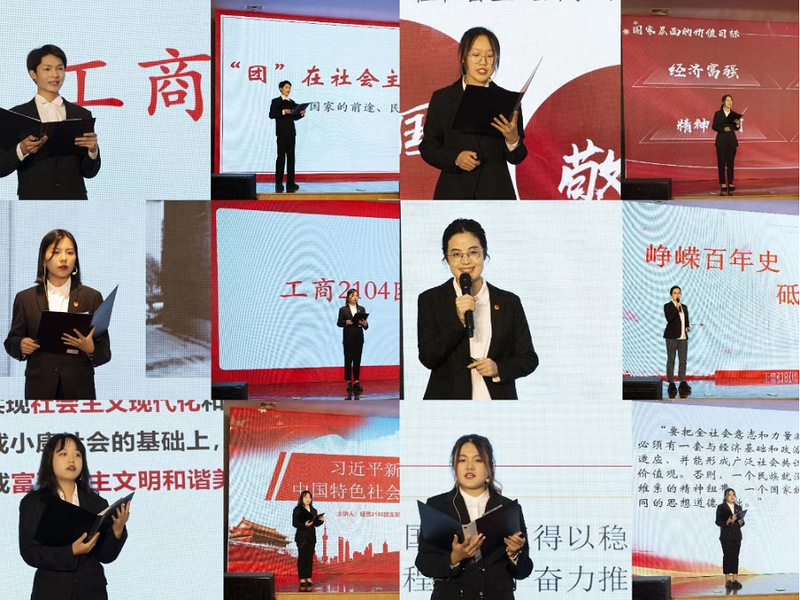 “风采青年展”环节中,各团支部通过合唱、诗歌朗诵、舞台剧等形式充分展现了团支部的活力与风貌。工商2110团支部以改编版歌曲《少年》,呈现了新时代青年昂扬向上的精神面貌。工商2105团支部带来了一段激情澎湃的朗诵,饱含深情地讴歌了党的丰功伟绩。工商2001团支部以歌曲《我爱你中国》抒发了对祖国母亲的深深热爱。工商2104团支部以一段铿锵有力的朗诵,带领大家回望了共青团百年的光荣历史。工商2107团支部通过一段历史剧的精彩表演,活灵活现地演绎出中国共产党党员的勇敢无畏,不怕牺牲的崇高信仰。经贸2102团支部以真挚热烈的朗诵赞美了五四精神,讲述了他们在五四精神的指引下砥砺奋进的故事。国贸2001团支部演唱改编版歌曲《你的答案》,致敬一百年来矢志报国、为国家发展前赴后继的伟大前辈。