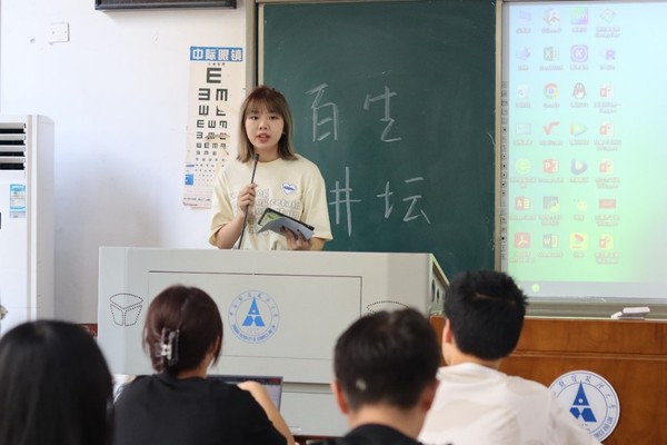 主讲人刘旻妤围绕“坚定文化自信,贡献青年力量”展开演讲。河南卫视中秋晚会、春节联欢晚会节目“只此青绿”、还原创新中国传统服饰的up主,还有许多青年人交出了自己的答卷,使传统文化屹立于民族自信之林。