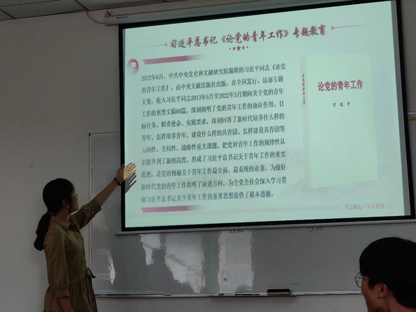 活动伊始,王培羽介绍了党的二十大的相关背景与重要意义,同时宣传了习近平总书记《论党的青年工作》的中心思想。该书深刻阐明了党的青年工作的地位作用、目标任务、职责使命和实践要求,深刻回答了新时代培养什么样的青年、怎样培养青年,建设什么样的共青团、怎样建设共青团等方向性、全局性、战略性的重大课题,有利于提升支部成员的思政素养。
