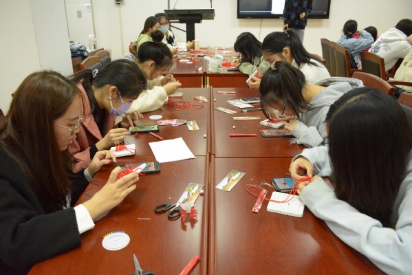 随后,学院学生会生活权益部的干事们进行了小组教学。在他们的帮助下,同学们一边跟随中国结编织教学视频,一边把红线绕圈、挑压、打结,在实践中相互学习和帮助,交流心得与想法。一根根简单的红绳逐渐变成一个个美丽吉祥、寓意团结和谐的中国结。制作完成后,同学们互相展示自己的劳动成果,把活动现场气氛推向了高潮。