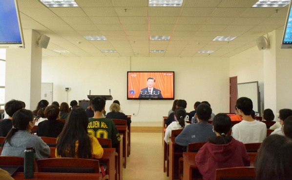 随后,习近平总书记代表十九届中央委员会向大会作报告,全体同学认真地聆听与学习。在报告中,习近平总书记对大会的主题进行了总结阐述,回顾了十八大以来对党和人民意义深远的三件大事和十年来贯彻坚持的一系列思想、方针、政策,明确提出了新时代新征程中国共产党的使命任务与中国式现代化的本质要求,并从各个角度全方位、深层次地对党和国家的发展事业进行了总结与展望。