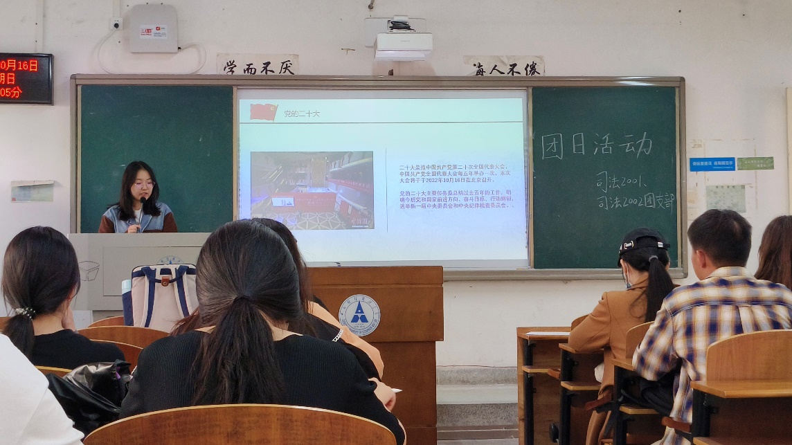 此次活动的主题是“学习二十大,永远跟党走,奋进新征程”,因此司法2001团支部书记张欣宜向同学们介绍了党的二十大,包括二十大的召开时间、召开目的,从而帮助同学们更好地了解党的二十大。之后团支书用一个视频介绍了中国这十年的伟大成就。十八大以来,我国的政治经济文化全面发展,人民幸福感日益提升。今年是习近平总书记提出“中国梦”的第十年,这十年来我国在经济发展、对外交流、文化自信、医疗保障、民族团结、脱贫攻坚、乡村振兴、绿色低碳等众多领域取得了显著成就,中国解决了许多长期想解决而没有解决的难题,办成了许多过去想办而没有办成的大事,党和国家事业取得历史性突破、发生历史性变革。
