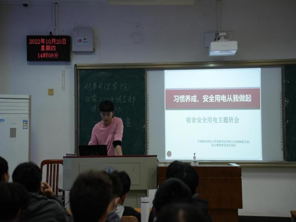 为了增强大家宿舍用电安全的意识,便于后续宣传活动的进一步开展,团支书首先面向全班同学开展了一次“习惯养成,安全用电从我做起”的宿舍安全用电主题班会。通过一则科普短视频引出宿舍安全的八个案例并为同学们说明了宿舍用电安全对于我们大学生生命安全的重要意义。随后又为同学们介绍了宿舍内禁止使用的大功率电器并列举了一些存在安全隐患的用电行为,最后介绍了正确的安全用电习惯、宿舍用电起火的解决办法。同学们在班会过程中收获到用电安全的可行措施,树立起宿舍用电的安全意识,为后续的宣讲活动做了有效的铺垫。