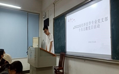 新闻网讯(学生通讯员 张秋蕊 包爱妮)2022年10月16日中国共产党第二十次全国代表大会于北京开幕,这是在全党全国各族人民迈上全面建设社会主义现代化国家新征程、向第二个百年奋斗目标进军的关键时刻召开的一次十分重要的大会。为深刻认识二十大精神,领悟先进思想,2022级经济法专业党支部于10月20日晚在文添楼208召开十月主题活动,支部书记李舒鑫、支部各党员出席了本次活动。