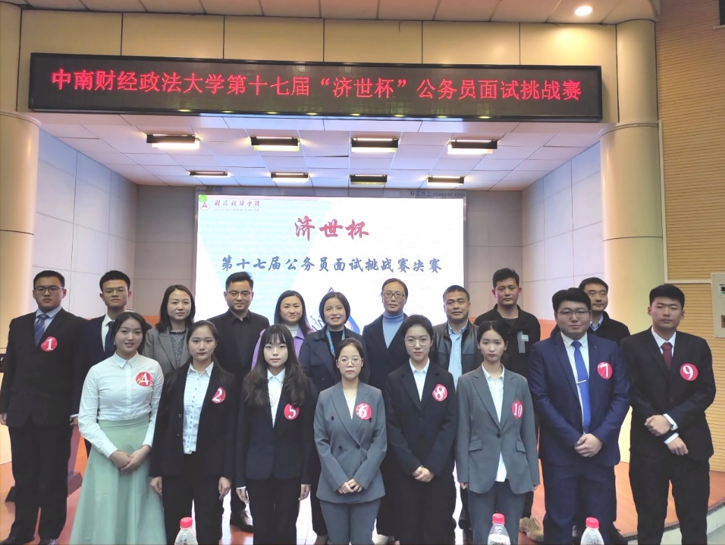新闻网讯(学生通讯员 陆宣宁 后雯佳 汤智涵)2022年11月17日晚上七点,中南财经政法大学第十七届“济世杯”华图公务员面试挑战赛决赛于文潭楼一楼招聘厅顺利召开。出席本次大赛的领导和嘉宾有:湖北省税务局人事处副处长肖燕、湖北省财政厅农村处二级调研员刘艳、中南财经政法大学就业指导服务中心副主任詹万明、财政税务学院党委书记袁桂君、财政税务学院党委副书记吴兴华、华图教育湖北分校教学教研主任马少、华图教育湖北分校教学教研副主任文健以及财政税务学院学生工作办公室的各位老师们。