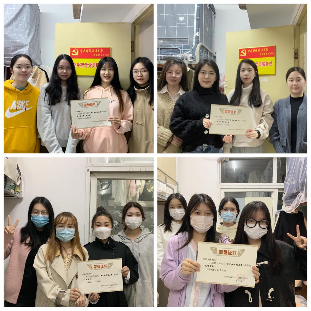 活动主要分为两部分。第一部分,各参评宿舍提交相关展示材料。各参评宿舍成员积极参与卫生打扫与整理,通过照片和视频的形式展示其干净整洁的宿舍环境和良好的寝风。第二部分,评委依据展示材料进行评选。我院主席团成员和各部门负责人本着公平公正公开的原则,从宿舍卫生、宿舍环境、视频内容创意等方面着眼进行评选。经过评比,推选环湖9栋121宿舍和 环湖9栋125宿舍为学生宿舍党员服务站,环湖9栋122宿舍和环湖9栋123宿舍为文明宿舍。