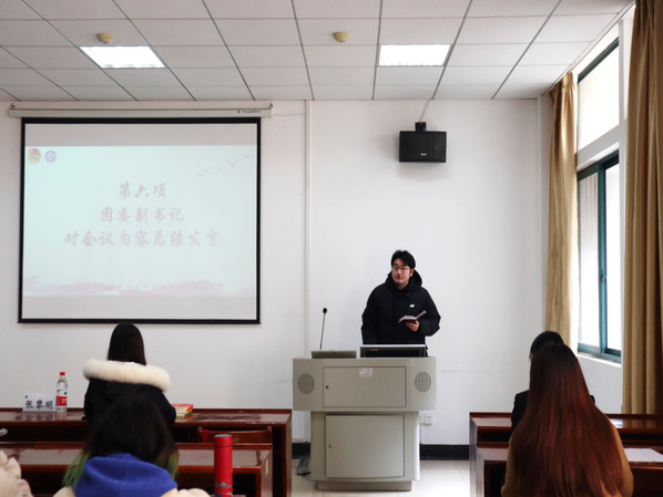 大会最后一项,由团委副书记肖煜隆对会议内容进行总结。他将团日活动设计大赛的一些具体细节向大家进行了详细阐述,并对即将到来的“五四”综合表彰进行了预告,向各位班团介绍评比的注意事项,希望各位班团能够把握好各项规则,做好各团支部的工作。