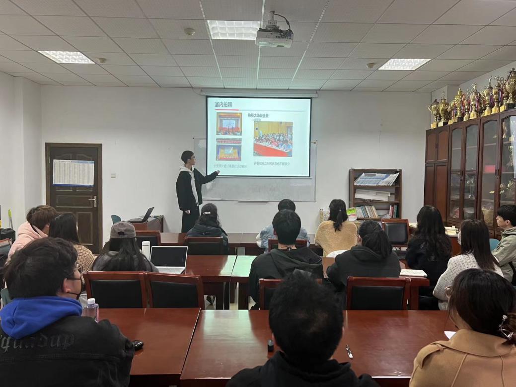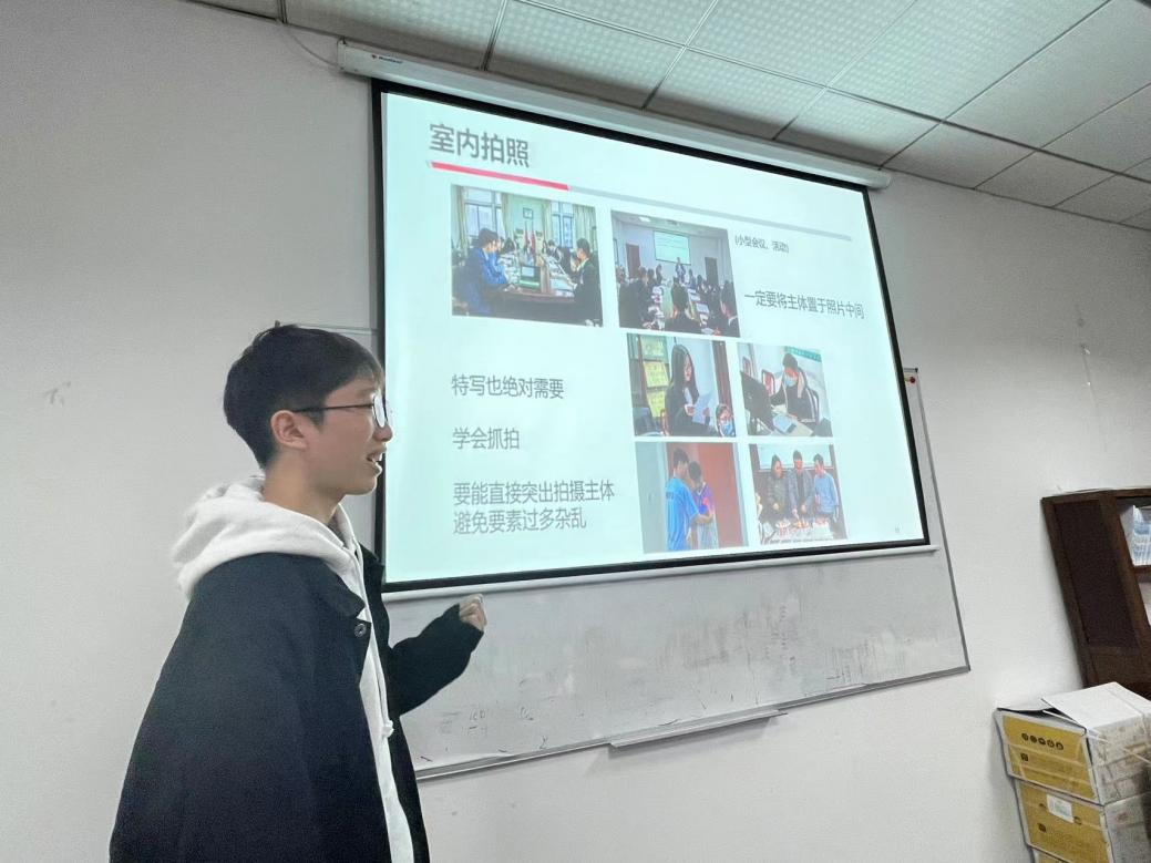 培训于12:45准时开始,吴彦恺首先分享了摄影的前期准备工作,随后介绍了三种构图方法——“中心构图”、“三分构图”和“对称构图”,他借助“井字格”将三种构图技巧做了区分,并举出实例加深印象。接下来,吴彦恺从“室内摄影”和“室外摄影”两方面分别讲解摄影技巧,同时教授同学们如何选择机位和调设快门速度。他还说道:“特写和抓拍都是必备技能,在抓拍时一定要将主体置于照片中间,要能直接突出拍摄主体,避免要素过多而显得杂乱。”最后,吴彦恺介绍了拍摄合照的方法与技巧,强调合照画面要居中,人物要具有层次感,同时也展示出拍摄效果较好的图片供同学们参考对比。