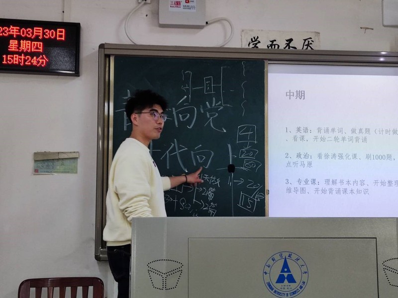新闻网讯(学生通讯员 冯宝辰 余立睿)为充分发挥榜样的引领作用,帮助同学们更好地备战考研,工商管理学院学生会于3月30日下午,在南湖校区文澜楼202教室成功举行榜样分享会第九期。本次分享会由农经1901班班长、2022“榜样工商”十佳青年“砥柱英才”称号获得者——侯典璞担任主讲人。