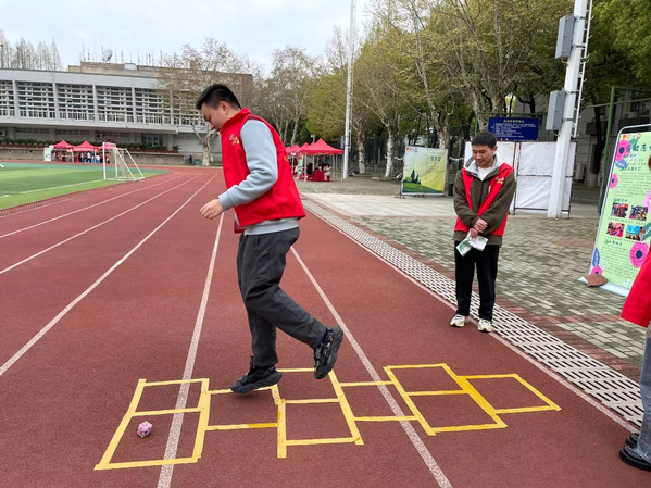 活动第二项是“跳房子”游戏。参与者通过扔沙包决定不可跳入的格子,单双脚交换跳格子,在沙包所在格子之前捡起沙包,并完整跳完所有格子即为挑战成功。本游戏将德育与体育结合,新颖有趣,吸引了众多参与者。
