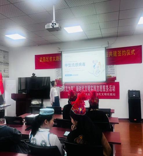 蔬菜二队主要负责印制宣传单并于社区公告栏对宣传单进行张贴,同时在活动过程中向社区居民和学生分发宣传单并细心地为居民们介绍甲流知识。在社区的场地支持和宣传下,二队成员在千家街社区服务中心内为居民们上了一堂甲流知识普及课,用生动形象的一节普及课来提升大家对甲流的进一步认知,打破大家对甲流的误解偏见。