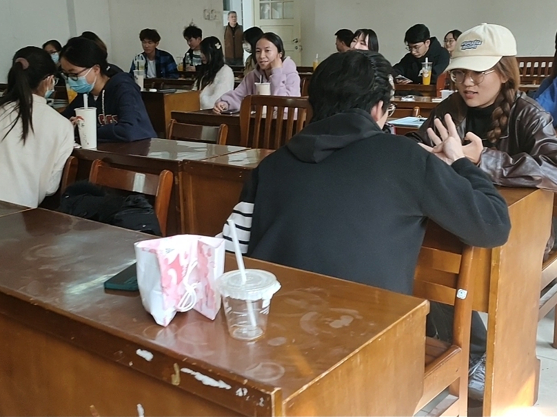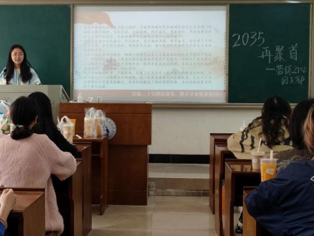 活动第一环节,由团支书胡慧娟同学向大家宣布会议主题及内容。本次活动的主题为“启航二十大,2035再聚首”,整个团日活动以“穿越到2035”为主线,设置了2035年再回母校参加班级聚会、户外打卡模拟多年后同学们三五结伴再看校园、最后相聚于约定的教室开展同学聚会等环节,将同学们代入2035这一关键年份。2035年是中国尤为特殊的一年,到2035年我国将基本实现社会主义现代化的远景目标,也是我们向第二个百年奋斗目标进军的关键一年。对于整个团日活动的主题而言,选定2035年这一特殊年份,既是国家重要之年,也是我们个人“三十而立”之年,通过穿越情境,让大家认识到当代青年要让青春在全面建设社会主义现代化国家的火热实践中绽放绚丽之花。