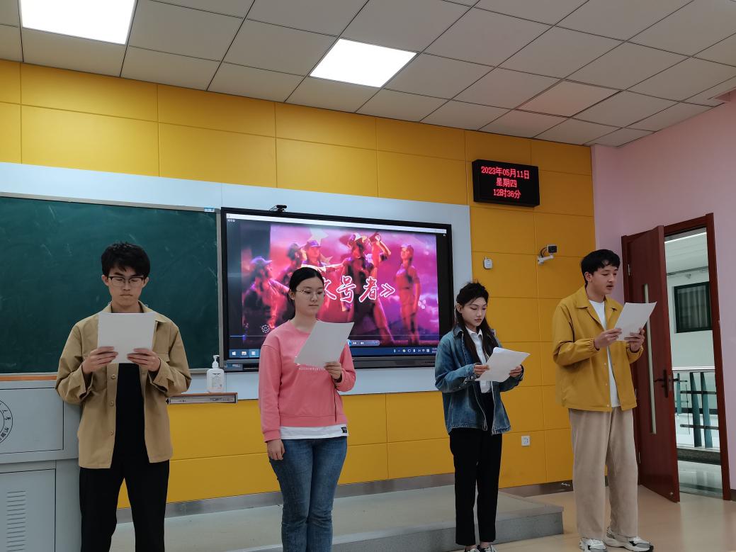 《吹号者》是诗人艾青的经典作品之一,在这首诗中作者为我们展现了一个吹号者和浸濡着血迹的铜号的形象,激励着中华民族奋勇向前。选手杨康妮、王子键、杨洋、胡馨予将其作为参赛作品,用激昂的语调宣告着吹号者的奋勇与坚持。在一次又一次的呼喊中,现场的观众皆折服于选手的饱满激情。在他们表演的感染下,青年人的热情也被激发,高昂情绪传递洋溢在教室里的每一个角落。表演结束后,现场爆发了激烈的掌声。