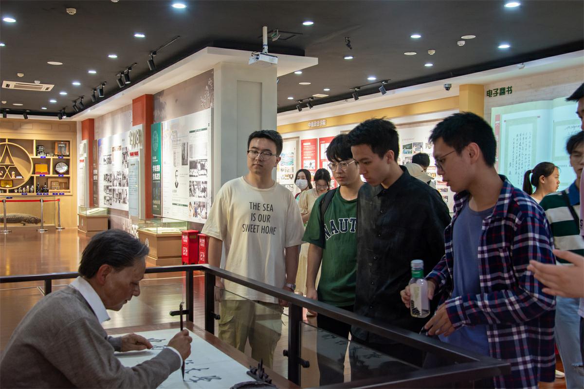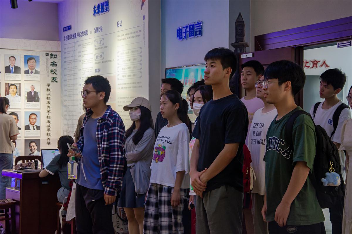 步入二楼的展厅,一幅幅陈旧的照片折射时代缩影,把他们带回了那些艰难求索、砥砺前行的岁月;一件件泛黄的文物见证峥嵘时光,静静地展现几十年前的风华;一张张简洁的说明牌讲述发展历程,带领他们感悟那些波澜壮阔的历史。无论是展现邓小平同志为我校题字的珍贵塑像,还是校友采集制作的中华鲟标本,抑或是能随着我们手部动作而翻阅的电子书籍,都进一步让学员们深刻体验到我校在建设过程中的卓越成就和光辉历史,增强了身为青年学子的自豪感和使命感。