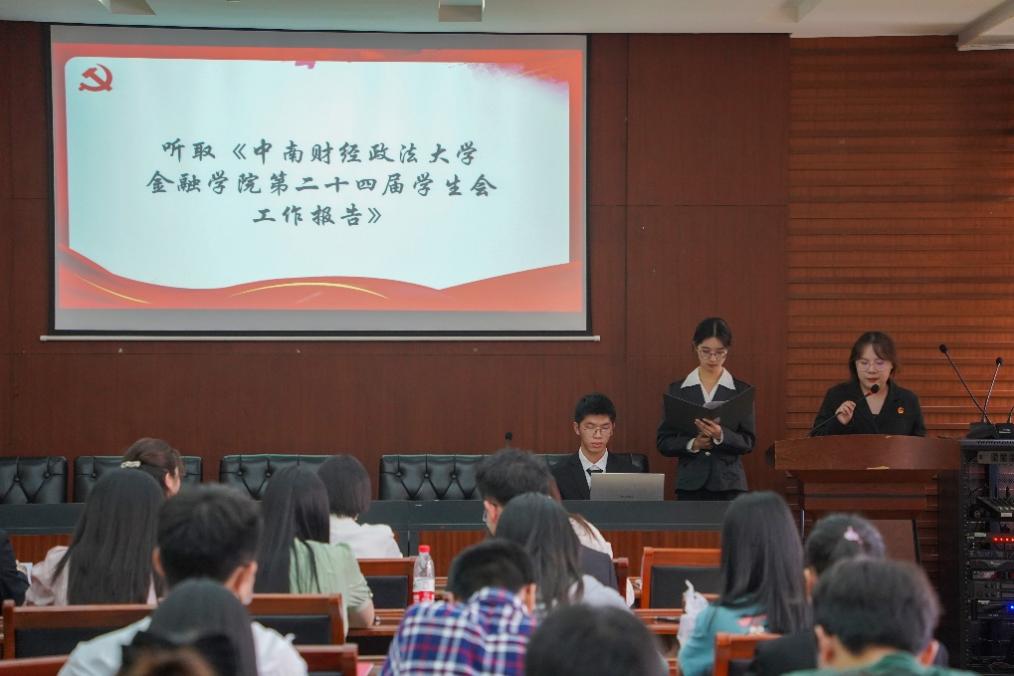 大会第三项,金融学院学生会主席团成员杨雯雨作《中南财经政法大学金融学院第二十四届学生会工作报告》,回顾了学生会过去一年在校学生会和院团委的正确指导下,坚决贯彻落实“全心全意服务师生”的宗旨;坚定“参与学生民主管理,提供民主实践平台,维护学生合法权益,丰富校园文化生活,提高学生综合素质”的基本方针,在思想建设、组织管理、“三全育人”、“五育并举”等各个方面积极开展各项活动,着力建设服务型学生会,进一步推进学生会的发展和改革事业。今后,学生会也将不断学习和吸收历届学生会工作中积累的经验教训,开拓创新,锐意进取,金融学院学生会定能乘风万里,扶摇直上!