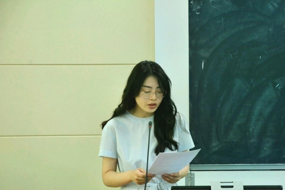 结课仪式伊始,全体起立,奏唱中国共产主义青年团团歌。团委徐敏睿同学发表了结课发言,她总结了这一学年青马班、学习社开展的一系列学习理论知识与实践活动,强调青马班、学习社的开展对加深学员对马克思主义的认识、勇担国家重任发挥了重要作用。