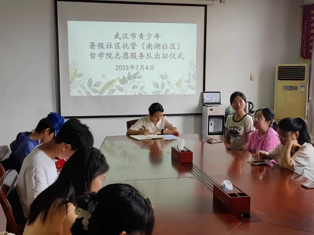 据悉,为做好本次南湖社区暑期托管志愿服务,哲学院志愿者协会提前面向全校招募、选拔了近十位志愿者,并对志愿者进行了专业培训。7月4日,哲学院在文沛楼319会议室举行了哲学院“南湖社区暑期托管”志愿服务队出征仪式,院团委书记陈意萍老师对志愿者们开展行前培训。在接下来的托管志愿服务中,志愿者们将对托管室学生开展课业辅导、情感陪伴、心理疏导等活动,并结合学院学科特色以及团学活动特色开展哲学启蒙、手工创作等特色课程,陪伴孩子们度过充实快乐的假期。