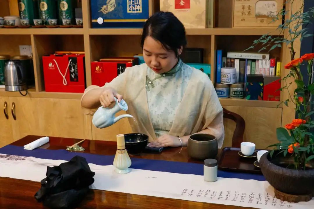 活动正式开始,主持人首先介绍了茶的历史渊源和中秋品茶的习俗,随后师生们在悠扬婉转的古筝乐曲声中品味醇香微苦的茶水,欣赏美妙优雅的宋代点茶茶艺表演,感受中华茶文化的独特魅力。