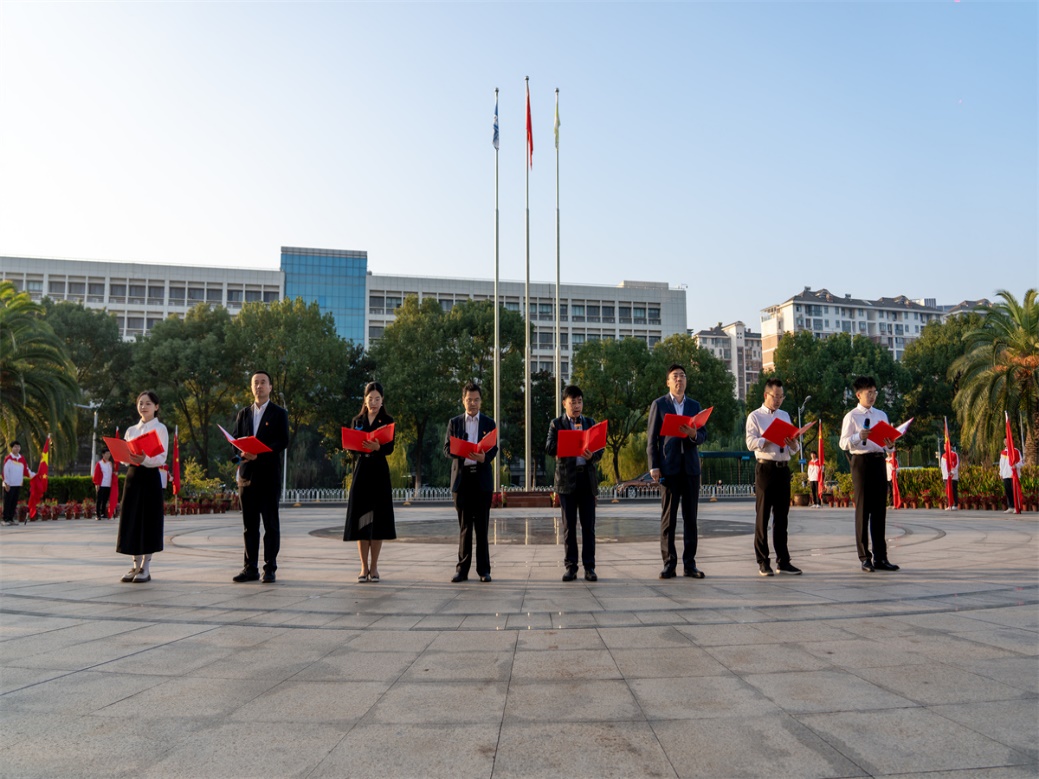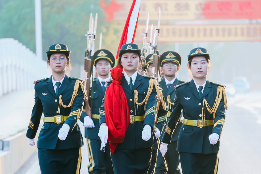 国旗护卫队目光坚定、步履铿锵,护卫着国旗走向升旗台前。在清晨曙光的照耀下,全体成员心怀敬意;在威严庄重的国歌声中,五星红旗冉冉升起。