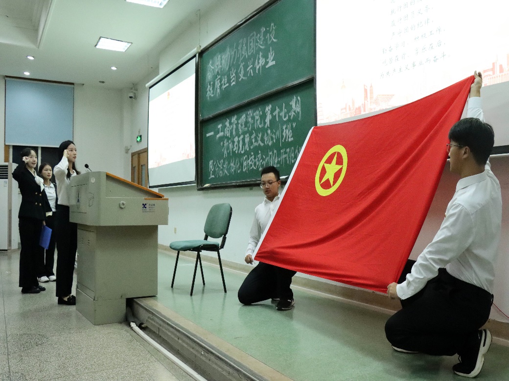 开班仪式在富有激情和朝气的团歌声中拉开序幕,全体团员在工商管理学院分团委学生副书记黄子恩的带领下重温入团誓词。