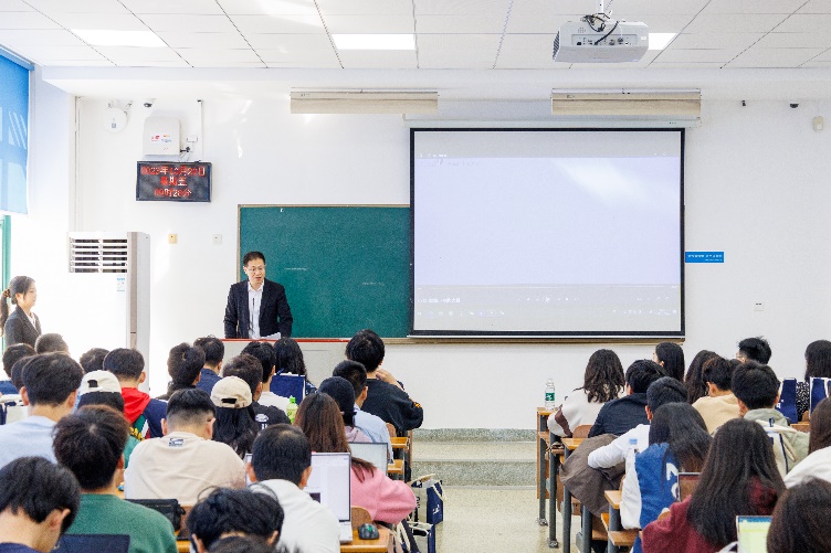 随后,深圳证券交易所基金管理部总监邹雄发表致辞,介绍了举办本次活动的目的和意义,并阐释了当前资本市场对于国民经济、社会发展的重要意义。致辞结束后,邹雄还为学生们带来了精彩的一课,回顾了我国多层次资本市场的发展历程,并分析了中西方股市、债市、基金等资本市场的特点和差异,鼓励在校学生加强专业知识学习,深入了解、掌握资本市场相关知识,同时希望在校学生能够开阔眼界,多学习、多比较不同的投资方法和投资理念。