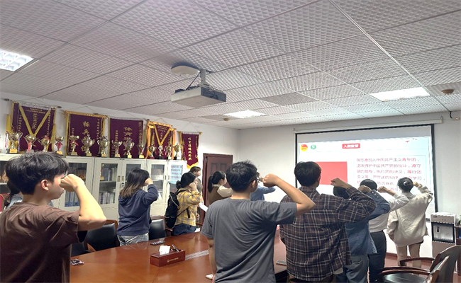 随后,全体新发展团员面向团旗庄严宣誓,杨尚同学作为领誓人,带领团员们郑重承诺将遵守团的章程,执行团的决议,履行团员义务,严守团的纪律。铿锵有力的宣誓声表达着团员同志们入团的信心和决心,以及为共产主义事业奋斗终身的承诺。