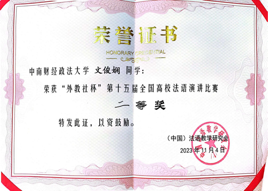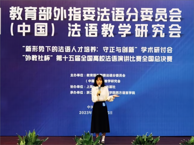 新闻网讯(通讯员 孟念慈)11月4日,由教育部外指委法语分委会和中国法语教学研究会主办的第十五届“外教社杯”全国高校法语演讲比赛总决赛落下帷幕,外国语学院法语专业文俊娴同学荣获全国二等奖。
