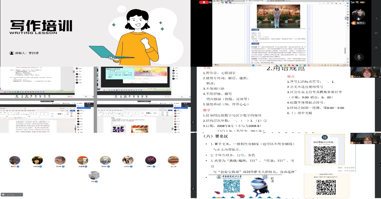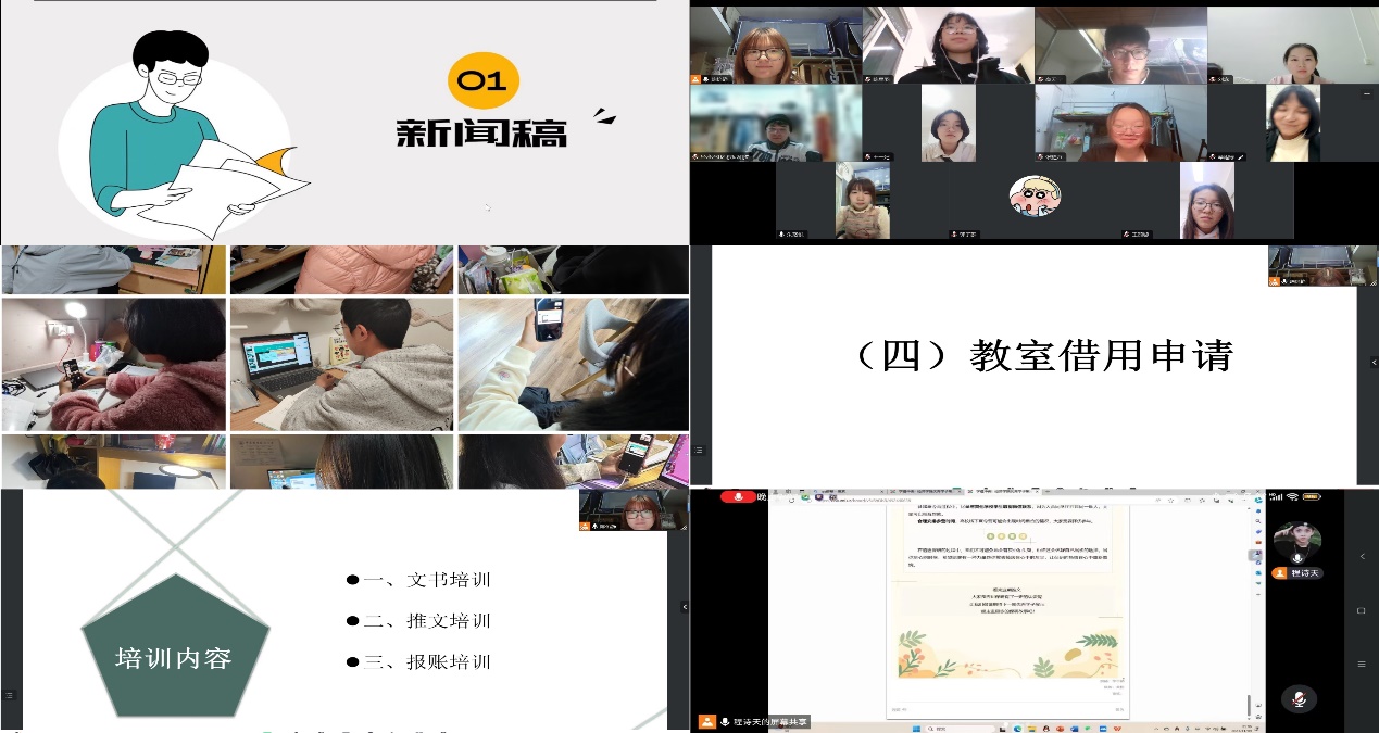团学各部门围绕日常工作要点,根据成员自身情况对成员们进行差异化培训。新闻与网络技术部对摄影技术要点以及稿件撰写方法进行了重点培训,学术部主要在部门工作的细节处理方式进行讲解,秘书处开展了部门的日常工作培训,创业实践部从文书、推文、报账三方面进行了详细指导,外联部则针对公文、推文、赞助等环节展开培训学习,其他各部门也进行了相应的业务培训。