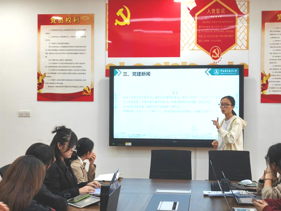 会议邀请了法学院新闻中心主任徐菁林、摄影部副部长王艺瑾,团委宣传部宣传设计中心副主任李瑞笛、新媒体运用中心副主任郝紫熙四位同学为大家作分享。四位嘉宾依次从新闻写作、摄影技术、推文创作、海报设计四个方面向团总支成员传授工作技能,分享工作经验。分享内容条理清晰、细致全面,全体成员聆听仔细,记录认真。