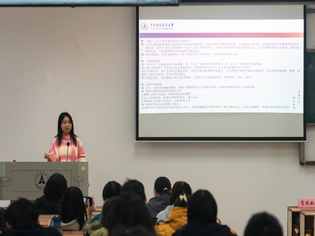 新闻网讯(学生通讯员 胡漪 何胤良)铅华褪尽,层林尽染。为进一步激发我院学生开展科学研究、社会实践的热情,营造良好的科研创新氛围,经济学院“博文 大创 实践活动” (即“博文杯”“大学生创新创业大赛”与“社会实践活动”)指导会于11月18日下午在我校首义校区文泽楼303教室举行。经济学院经济学拔尖人才实验班2020级本科生肖欣如担任主讲人,2023级全体学生到场参会。