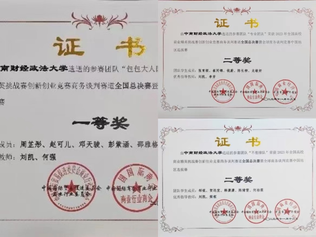 新闻网讯(学生通讯员 王泽宇 刘歆瑶)11月12日,历时三个多月的2023年全国高校商业精英挑战赛创新创业竞赛商务谈判赛道全国总决赛暨全球商务谈判竞赛中国地区选拔赛圆满落幕。由工商管理学院李芳副书记、刘凯副教授、何强老师指导并选派的包包大人队、专业团队和不想排队代表我校分别斩获全国一等奖和两个二等奖,国际经济与贸易专业的周芷彤同学和崔同锦同学获得“最佳谈判手”称号,三位老师获“优秀指导老师”称号。