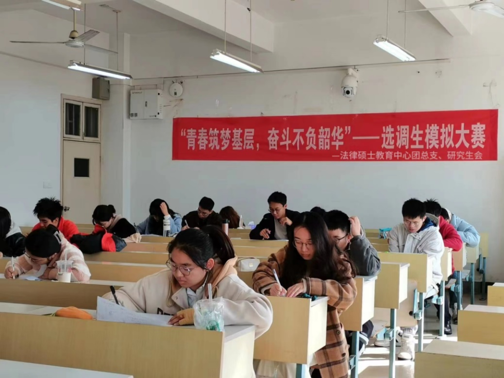 新闻网讯(学生通讯员 肖玲 李佳鑫)11月18日,法律硕士教育中心“济世杯”系列就业指导活动——“青春筑梦基层 奋斗不负韶华”选调生模拟大赛初赛于文添楼202、205教室成功举行。本次大赛旨在深入学习贯彻党的二十大精神,落实党中央、国务院关于促进高校毕业生就业的决策部署,贯彻落实省第十二次党代会精神和省委、省政府工作要求,推进高校学生就业,深化同学们对公务员职业前景的认识、培养公考应试能力,助力同学们成为一名合格的综合应用型公务人才,圆梦公考。