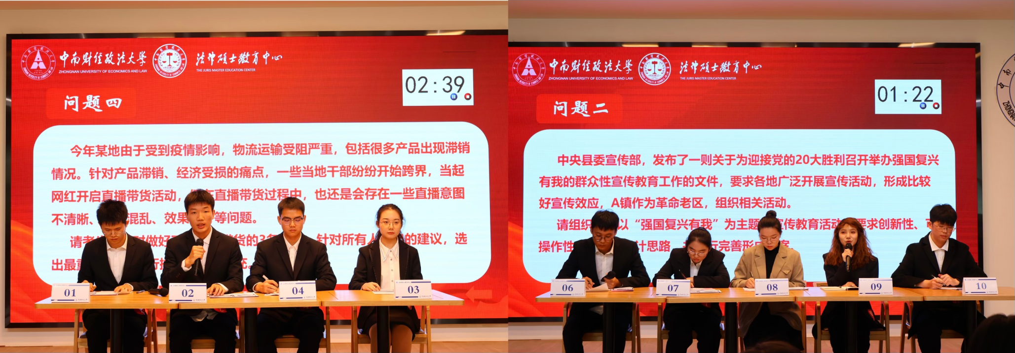 经过初赛的选拔,共有来自会计学院、法与经济学院、法学院、法律硕士教育中心的10名同学晋级本次决赛。决赛设置无领导小组讨论、结构化面试2个环节,赛中还穿插了有奖竞答活动。